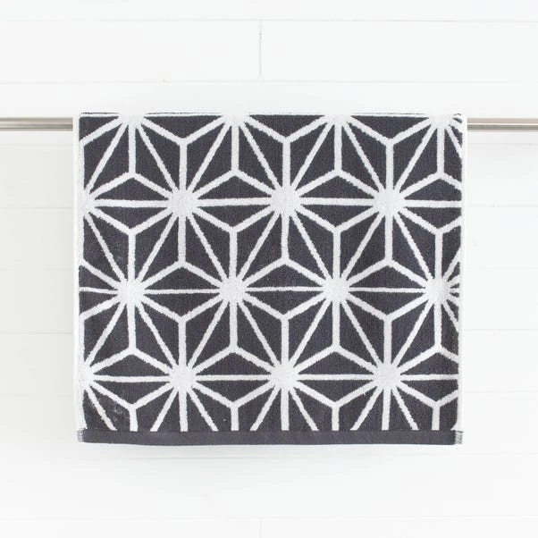 Available in charcoal grey, this towel is patterned with a modern, white geo design. For ultimate softness, this towel has been crafted from 100% cotton with a 550 GSM weight quality. Available in two sizes.