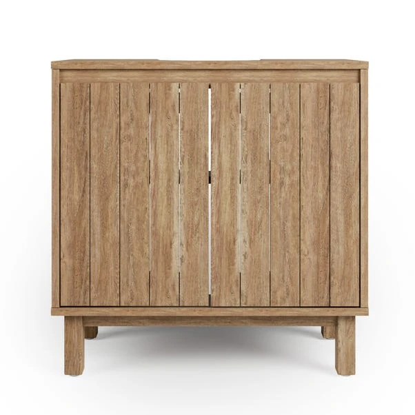 This mango wood effect undersink unit fits snugly under your existing sink, making it a smart space saving solution to store all your bathroom essentials and toiletries out of sight for a clutter-free space. With a slatted wood effect finish with 2 doors and 2 shelves, this unit is both stylish and practical.