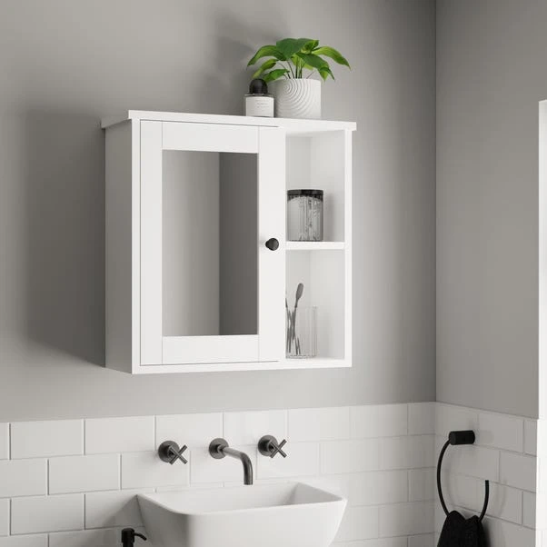 Perfect for any smaller bathroom in need of storage, this mirror cabinet comes complete with large glass mirror pane that instantly enhances the feeling of light and space in your bathroom. Half of this wall unit has 2 open shelves, making it easy to grab towels and toiletries. The other half is hidden behind a cabinet door and is perfect for medicines and more.