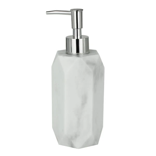 This modern marble patterned lotion dispenser is crafted from resin and features a pump application with matching bathroom accessories available.