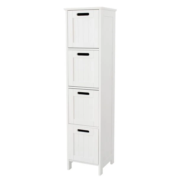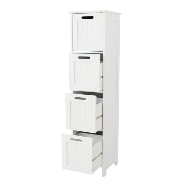 This simple and stylish 4 drawer storage unit is an ideal storage solution for your bathroom. With 4 drawers you can store all your bathroom essentials, towels, toilet rolls, and more. The surface of this unit is perfect for displaying your bathroom ornaments, perfumes, plants, and more. This unit features a beautiful tongue and groove opening design. Fully assembly required.