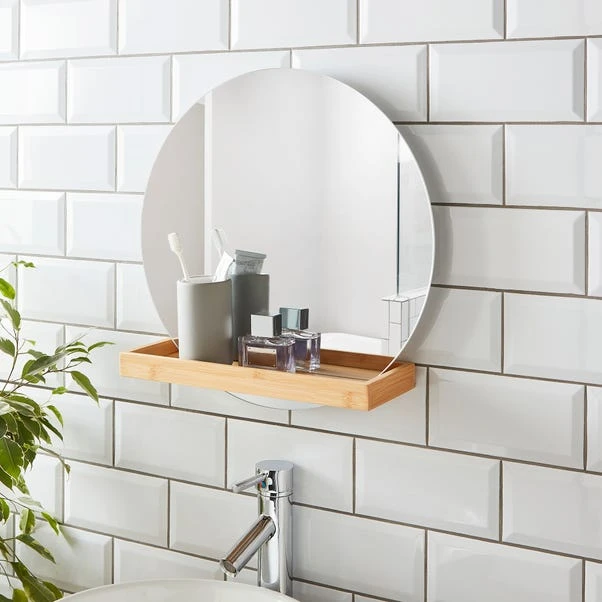 Featuring a minimalist circular design, this bathroom mirror includes a shelf to store essentials, crafted from durable bamboo wood.