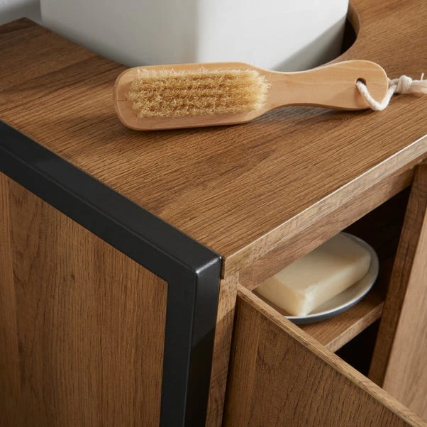 Boasting an oak effect and black metal frame this under sink unit gives your bathroom a ultra modern finish whilst also providing your bathroom with ample storage space. This unit includes 2 internal shelves that are ideal for organising all your bathroom toiletries. With a sleek handle-free design this under sink unit fits snuggly under most standard sinks.