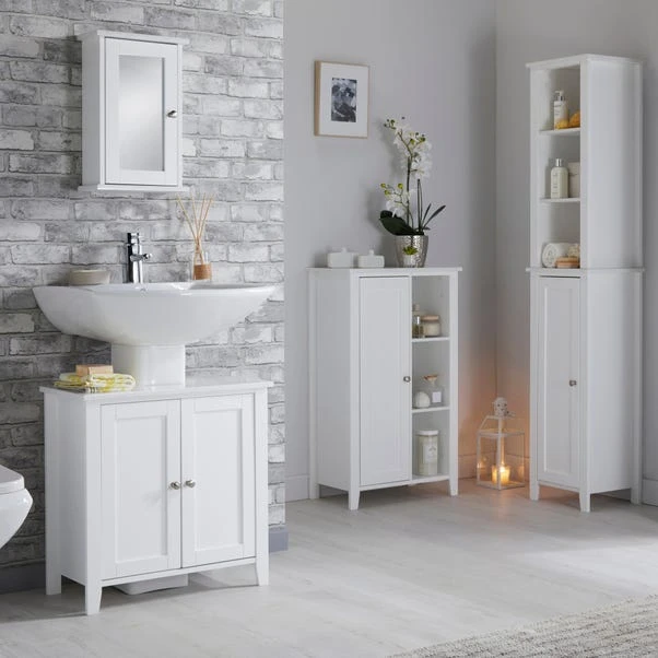Featuring a contemporary marble effect with a chrome handle to finish, this console unit looks sleek and stylish, perfect for your bathroom space. It is easy to assemble and boasts ample storage space, with 5 shelves and 1 door, to tidy away clutter, keeping your bathroom neat. Coordinate with our other marble bathroom storage units and accessories to complete the look. This range is exclusive to Dunelm.