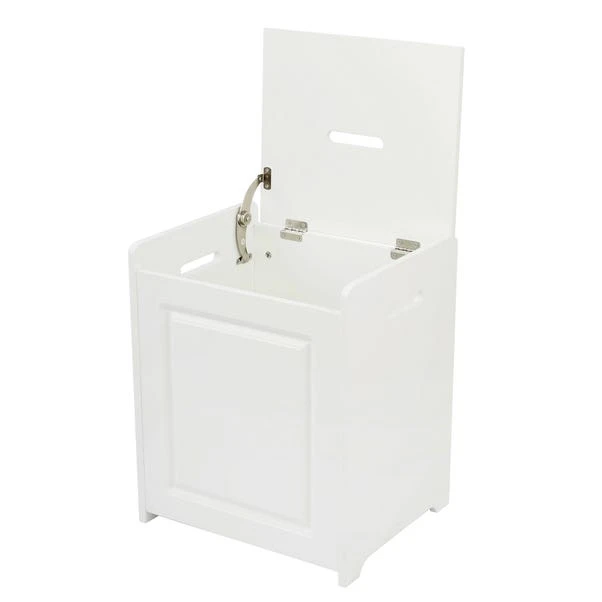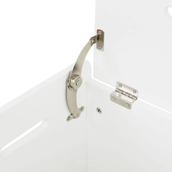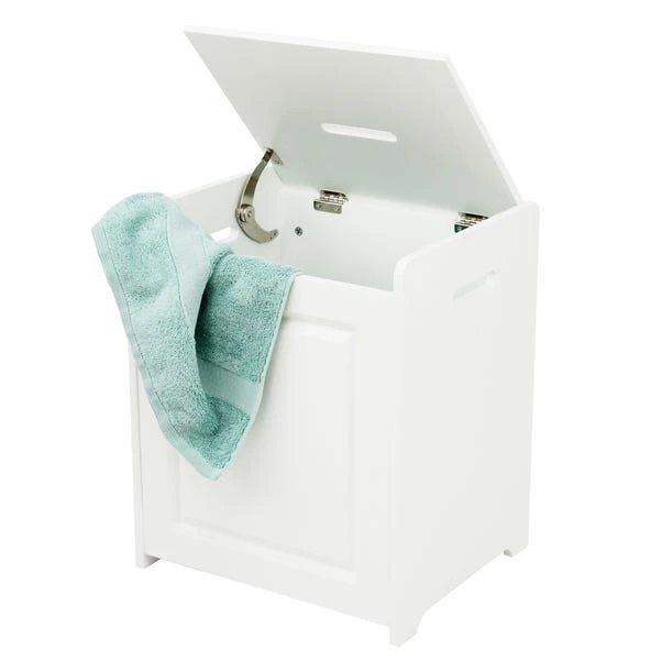 Equipped with a top and side handles, this easily assembled white laundry basket is fitted with a safety hinged lid and features traditional front panel detail.