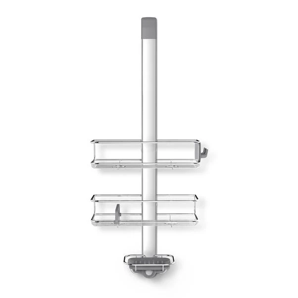 This silver simplehuman over door shower caddy is ideal for any bathrrom, with adjustable shelves this caddy can store all your shower must haves. With an easy install hook hanger, this caddy requires no drilling. Featuring a seperate quick-dry soap diash, and an additional hook to hold items such as razors this caddy provides lots of storage space. Made from a rust proof material this caddy comes with a 5 year warranty.